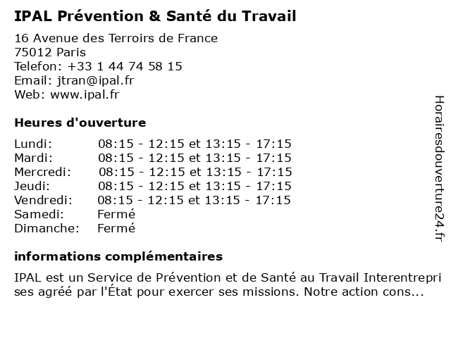 1 IPAL Prévention & Santé du Travail (Distance: 7,82 km) 10 Rue du Séminaire, 94550 Chevilly-Larue du, ipal, prévention, santé, travail 2 IPAL Service de Santé au Travail (Distance: 1,03 km) 6 Rue Henri Desgrange, 75012 Paris au, de, ipal, santé, service, travail 3 Centre de Soins d’Accompagnement et de Prévention en Addictologie - CSAPA (Distance: 1,91 km) 64 Avenue Georges Gosnat, 94200 Ivry-sur-Seine accompagnement, addictologie, centre, csapa, de, d’accompagnement, en, et, prévention, soins 4 Efficience Santé au travail (Distance: 2,25 km) 211 Boulevard Vincent Auriol, 75013 Paris au, efficience, santé, travail 5 IPAL Service Médical du Travail (Distance: 2,66 km) 45 Rue Raspail, 94200 Ivry-sur-Seine du, ipal, médical, service, travail 6 GIE Santé-Centre Voltaire (Distance: 2,79 km) 52 Rue Léon Frot, 75011 Paris centre, clinique, gie, hôpital, hôpitaux, santé, services, voltaire |