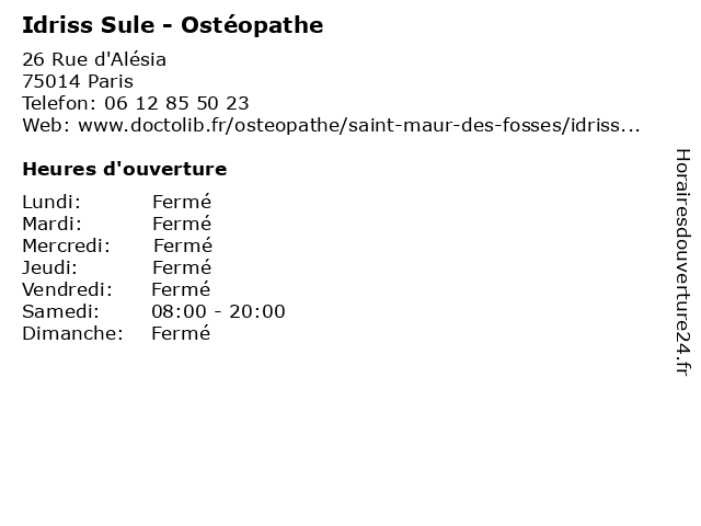 1 Idriss Sule - Ostéopathe (Distance: 11,87 km) 24 Rue Baratte Cholet, 94100 Saint-Maur-des-Fossés cervicalgie, dorsalgie, idriss, kinésithérapeute, lombalgie, os, ostéopathe, sule 2 Dr Idriss Tourabaly - Chirurgien orthopédiste (Distance: 0,61 km) 42 boulevard Jourdan, 75014 Paris chirurgien, consultation, docteur, dr, idriss, med, médecin, médecine, orthopédiste, tourabaly, traitement 3 Dr Idriss Mbombo Nkouandou - Médecin généraliste (Distance: 6,36 km) 22 Rue de la Petite Saussaie, 94400 Vitry-sur-Seine docteur, dr, generaliste, généraliste, idriss, mbombo, medecin, médecin, nkouandou, soins 4 Dr Idriss Tourabaly - Chirurgien orthopédiste et traumatologue (Distance: 6,88 km) 23 Rue Brochant, 75017 Paris chirurgien, dr, et, idriss, orthopédiste, tourabaly, traumatologue 5 Idriss Baba-Aissa - Masseur-kinésithérapeute (Distance: 7,18 km) 43 Rue du Télégraphe, 75020 Paris aissa, baba, docteur, idriss, kine, kinesitherapeute, kinésithérapeute, masseur 6 Dr Idriss Tourabaly - Chirurgien orthopédiste et traumatologue (Distance: 7,69 km) 67 Rue de Romainville, 75019 Paris chirurgien, consultation, docteur, dr, et, idriss, med, médecin, orthopédiste, tourabaly, traitement, traumatologue |