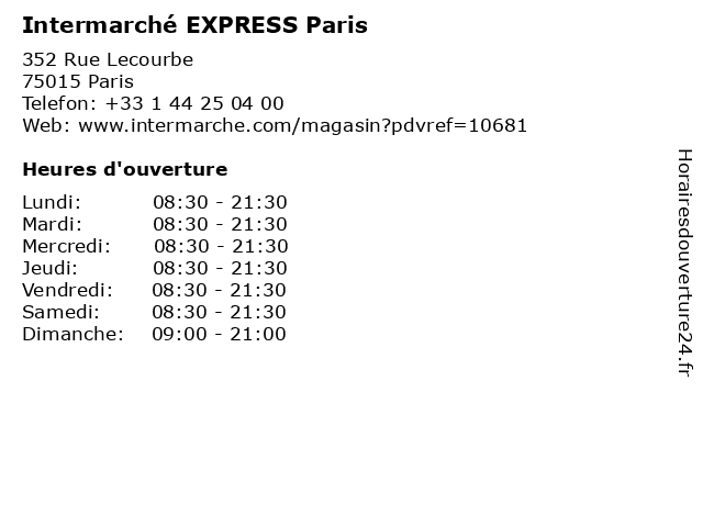 1 Intermarché EXPRESS Paris (Distance: 1,20 km) 81 83 Rue st charles, 75015 Paris express, intermarché, paris 2 3 Intermarché EXPRESS Paris (Distance: 1,68 km) 21 Rue Brancion, 75015 Paris express, intermarché, paris 4 Intermarché EXPRESS Paris (Distance: 2,59 km) 107 Avenue de la Bourdonnais, 75007 Paris express, intermarché, paris 5 Intermarché EXPRESS Paris (Distance: 4,32 km) 14 Avenue de la Grande Armée, 75017 Paris express, intermarché, paris 6 Intermarché EXPRESS Paris (Distance: 5,33 km) 36 Rue des Fossés Saint-Bernard, 75005 Paris express, intermarché, paris |