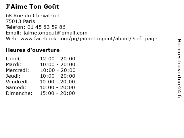 1 Restaurant Ton Hon (Distance: 3,05 km) 17 Rue Royer-Collard, 75005 Paris canard, chinois, hon, laqué, nuoilles, raviolis, restaurant, riz, soupes, ton, vapeur 2 Ton Air De Brest (Distance: 3,88 km) 9 Rue Maison Dieu, 75014 Paris air, bar, boissons, brest, café, de, lbpf, ton 3 Anh-Chi Ton - Sage-femme (Distance: 4,27 km) 86 Rue du Cherche-Midi, 75006 Paris anh, chi, femme, sage, sagefemme, sante, ton 4 Association Crée ton Avenir (Distance: 4,68 km) 5 rue Alphonse Bertillon, 75015 Paris accompagnement, association, avenir, collégiens, crée, jeunes, lycéens, orientation, ton 5 Dr Virginie Ton - Chirurgien-dentiste (Distance: 5,79 km) 37 Avenue du Président Wilson, 93100 Montreuil chirurgien, consultation, dentiste, docteur, dr, med, médecin, médecine, secrétariat, ton, traitement, virginie 6 Abbesses ton Slip (Distance: 6,74 km) 46 rue des Abbesses, 75018 Paris abbesses, du, français, slip, sous, ton, vetements |