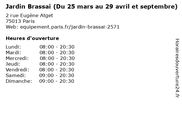1 Jardin Brassai (Du 29 octobre au 28 février) (Distance: 0,00 km) 2 rue Eugène Atget, 75013 Paris 28, 29, au, brassai, du, février, jardin, octobre, parc, square 2 Square Henri-Rousselle (Du 25 mars au 29 avril et septembre) (Distance: 0,22 km) 6 Place Paul Verlaine, 75013 Paris 25, 29, au, avril, du, et, henri, jardin, mars, parc, rousselle, septembre, square 3 Jardin des Deux-Moulins (Du 25 mars au 29 avril et septembre) (Distance: 0,64 km) 78 avenue Edison, 75013 Paris 25, 29, au, avril, des, deux, du, et, jardin, mars, moulins, parc, septembre, square 4 Parc de Choisy / Du 25 octobre 2015 au 29 février 2016 (Distance: 0,77 km) 128 avenue de Choisy, 75013 Paris 25, 29, 2015, 2016, au, choisy, de, du, equipement, février, jardins, l'heure, livre, médiathèque, octobre, parc, pricipaux parcs, services 5 Jardin Jean-Claude-Nicolas-Forestier (Du 25 mars au 29 avril et septembre) (Distance: 1,11 km) 12 rue Thomire, 75013 Paris 25, 29, au, avril, claude, du, et, forestier, jardin, jean, mars, nicolas, parc, septembre, square 6 Square du Docteur Navarre (Du 25 mars au 29 avril et septembre) (Distance: 1,21 km) - place du Docteur Navarre, 75013 Paris 25, 29, au, avril, docteur, du, et, jardin, mars, navarre, parc, septembre, square |