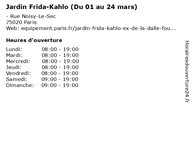 1 Jardin Frida-Kahlo (Du 25 mars au 29 avril et septembre) (Distance: 0,00 km) - Rue Noisy-Le-Sec, 75020 Paris 25, 29, au, avril, du, et, frida, jardin, kahlo, mars, parc, septembre, square 2 Square Emmanuel-Fleury (Du 01 au 24 mars) (Distance: 0,16 km) 40 rue Le Vau, 75020 Paris 01, 24, au, du, emmanuel, fleury, jardin, mars, parc, square 3 Square Séverine (Du 01 au 24 mars) (Distance: 0,55 km) 7 rue le Vau, 75020 Paris 01, 24, au, du, jardin, mars, parc, square, séverine 4 Parc de Belleville (Du 01 au 24 mars) (Distance: 1,92 km) 47 rue des Couronnes, 75020 Paris 01, 24, au, belleville, de, du, jardin, mars, parc, square 5 Parc de Belleville (Du 25 mars au 29 avril) (Distance: 1,92 km) 47 rue des Couronnes, 75020 Paris 25, 29, au, avril, belleville, de, du, jardin, mars, parc, square 6 Thevenin & Ducrot - Avia (libre service 24/24) (Distance: 2,72 km) 186 Avenue Galliéni, 94160 Saint Mandé 24/24, accessoires, avia, ducrot, libre, motos, service, services, stations, thevenin, voitures |