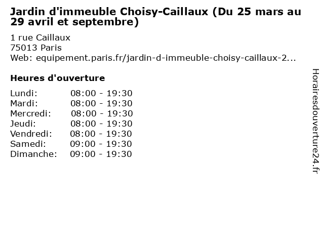 1 Jardin d'immeuble Choisy-Caillaux (Du 29 octobre au 28 février) (Distance: 0,00 km) 1 rue Caillaux, 75013 Paris 28, 29, au, caillaux, choisy, d'immeuble, du, février, jardin, octobre, parc, square 2 Jardin d'immeuble Choisy-Caillaux (Du 01 au 24 mars) (Distance: 0,00 km) 1 rue Caillaux, 75013 Paris 01, 24, au, caillaux, choisy, d'immeuble, du, jardin, mars, parc, square 3 Jardin d'immeuble Choisy-Caillaux (Du 30 avril au 31 août) (Distance: 0,00 km) 1 rue Caillaux, 75013 Paris 30, 31, août, au, avril, caillaux, choisy, d'immeuble, du, jardin, parc, square 4 Jardin Baudricourt (Du 25 mars au 29 avril et septembre) (Distance: 0,20 km) 14 rue de la Pointe d'Ivry, 75013 Paris 25, 29, au, avril, baudricourt, du, et, jardin, mars, parc, septembre, square 5 Jardin de la Dalle d'Ivry (Du 25 mars au 29 avril et septembre) (Distance: 0,22 km) 9 rue de la pointe d'Ivry, 75013 Paris 25, 29, au, avril, d'ivry, dalle, de, du, et, jardin, la, mars, parc, septembre, square 6 Jardin Juan-Miró (Du 25 mars au 29 avril et septembre) (Distance: 0,32 km) 40 rue Gandon, 75013 Paris 25, 29, au, avril, du, et, jardin, juan, mars, miró, parc, septembre, square |