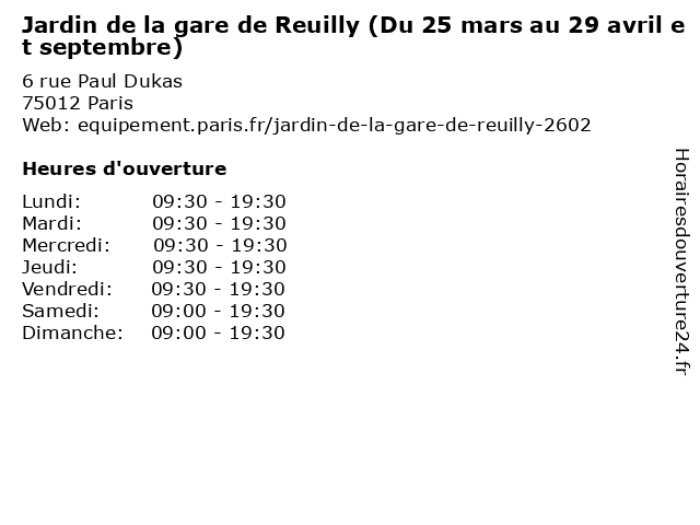 1 Jardin de la gare de Reuilly (Du 29 octobre au 28 février) (Distance: 0,00 km) 6 rue Paul Dukas, 75012 Paris 28, 29, au, de, du, février, gare, jardin, la, octobre, parc, reuilly, square 2 Jardin de la gare de Reuilly (Du 01 au 24 mars) (Distance: 0,00 km) 6 rue Paul Dukas, 75012 Paris 01, 24, au, de, du, gare, jardin, la, mars, parc, reuilly, square 3 Jardin de la gare de Reuilly (Du 30 avril au 31 août) (Distance: 0,00 km) 6 rue Paul Dukas, 75012 Paris 30, 31, août, au, avril, de, du, gare, jardin, la, parc, reuilly, square 4 Piscine Jean Boiteux ex Reuilly / Du 20 février 2016 au 06 mars 2016 (Distance: 0,25 km) 13 rue Hénard, 75012 Paris 06, 20, 2016, au, boiteux, du, equipement, ex, février, jean, joyeuse, l'heure, livre, mars, médiathèque, piscine, reuilly, services 5 Mairie De Paris (22 juillet au 1er septembre) (Distance: 0,27 km) 130 Avenue Daumesnil, 75570 Paris 1er, 22, administration, assoc, au, de, juillet, mairie, paris, septembre, services, services publics 6 Jardin de Reuilly -Paul Pernin (Du 25 mars au 29 avril et septembre) (Distance: 0,30 km) 15 rue Albinoni, 75012 Paris 25, 29, au, avril, de, du, et, jardin, mars, parc, paul, pernin, reuilly, septembre, square |