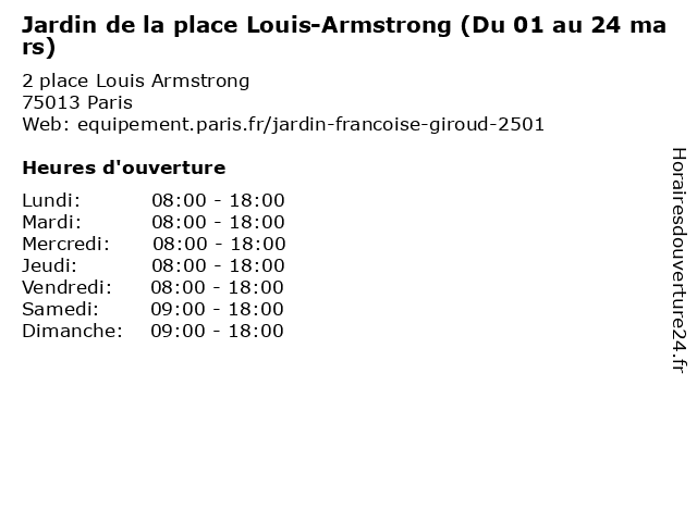 1 Jardin de la place Louis-Armstrong (Du 25 mars au 29 avril et septembre) (Distance: 0,00 km) 2 place Louis Armstrong, 75013 Paris 25, 29, armstrong, au, avril, de, du, et, jardin, la, louis, mars, parc, place, septembre, square 2 Jardin de la place Louis-Armstrong (Du 29 octobre au 28 février) (Distance: 0,00 km) 2 place Louis Armstrong, 75013 Paris 28, 29, armstrong, au, de, du, février, jardin, la, louis, octobre, parc, place, square 3 Jardin de la place Louis-Armstrong (Du 30 avril au 31 août) (Distance: 0,00 km) 2 place Louis Armstrong, 75013 Paris 30, 31, août, armstrong, au, avril, de, du, jardin, la, louis, parc, place, square 4 Jardin Roger-Priou-Valjean (Du 01 au 24 mars) (Distance: 2,00 km) 10 rue du Figuier, 75004 Paris 01, 24, au, du, jardin, mars, parc, priou, roger, square, valjean 5 Princesse Tam Tam (Du 19/10 au 24/10) (Distance: 2,32 km) 9 Rue Brea, 75006 Paris 19/10, 24/10, au, du, gorge-boxers, lingerie féminine, princesse, soutiens, tam 6 Jardin des Rosiers - Joseph-Migneret (Du 01 au 24 mars) (Distance: 2,42 km) 35-37 rue des Francs-Bourgeois, 75004 Paris 01, 24, au, des, du, jardin, joseph, mars, migneret, parc, rosiers, square |