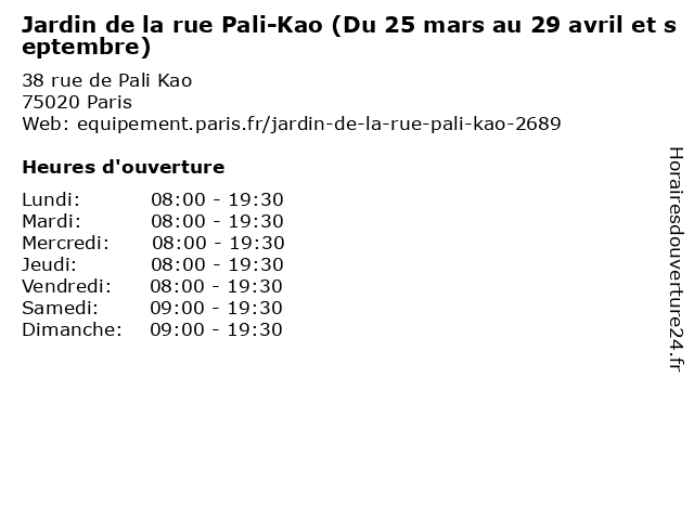 1 Jardin de la rue Pali-Kao (Du 29 octobre au 28 février) (Distance: 0,00 km) 38 rue de Pali Kao, 75020 Paris 28, 29, au, de, du, février, jardin, kao, la, octobre, pali, parc, rue, square 2 Jardin de la rue Pali-Kao (Du 01 au 24 mars) (Distance: 0,00 km) 38 rue de Pali Kao, 75020 Paris 01, 24, au, de, du, jardin, kao, la, mars, pali, parc, rue, square 3 Jardin de la rue Pali-Kao (Du 30 avril au 31 août) (Distance: 0,00 km) 38 rue de Pali Kao, 75020 Paris 30, 31, août, au, avril, de, du, jardin, kao, la, pali, parc, rue, square 4 Parc de Belleville (Du 25 mars au 29 avril) (Distance: 0,17 km) 47 rue des Couronnes, 75020 Paris 25, 29, au, avril, belleville, de, du, jardin, mars, parc, square 5 Jardin des Couronnes (Du 25 mars au 29 avril et septembre) (Distance: 0,20 km) - rue des Couronnes, 75020 Paris 25, 29, au, avril, couronnes, des, du, et, jardin, mars, parc, septembre, square 6 Jardin Maronites-Pressoir (Du 25 mars au 29 avril et septembre) (Distance: 0,30 km) 1 rue du Pressoir, 75020 Paris 25, 29, au, avril, du, et, jardin, maronites, mars, parc, pressoir, septembre, square |