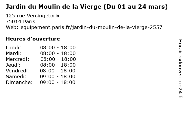 1 Jardin du Moulin de la Vierge (Du 25 mars au 29 avril et septembre) (Distance: 0,00 km) 125 rue Vercingetorix, 75014 Paris 25, 29, au, avril, de, du, et, jardin, la, mars, moulin, parc, septembre, square, vierge 2 Jardin du Moulin de la Vierge (Du 29 octobre au 28 février) (Distance: 0,00 km) 125 rue Vercingetorix, 75014 Paris 28, 29, au, de, du, février, jardin, la, moulin, octobre, parc, square, vierge 3 Jardin du Moulin de la Vierge (Du 30 avril au 31 août) (Distance: 0,00 km) 125 rue Vercingetorix, 75014 Paris 30, 31, août, au, avril, de, du, jardin, la, moulin, parc, square, vierge 4 Le Moulin de la Vierge (Distance: 0,11 km) 105 Rue Vercingétorix, 75014 Paris bakery, cake, de, desserts, la, le, moulin, vierge 5 Yespark, location de parking au mois - Moulin de la Vierge - Paris 15 (Distance: 0,17 km) 87 Rue de la Procession, 75015 Paris 15, au, de, la, location, mois, moulin, paris, parking, vierge, yespark 6 Square Pauly (Du 01 au 24 mars) (Distance: 0,36 km) 17 rue Pauly, 75014 Paris 01, 24, au, du, jardin, mars, parc, pauly, square |