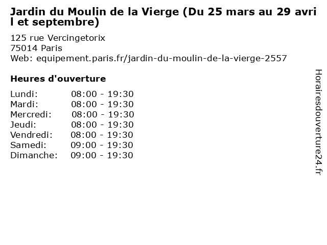 1 Jardin du Moulin de la Vierge (Du 29 octobre au 28 février) (Distance: 0,00 km) 125 rue Vercingetorix, 75014 Paris 28, 29, au, de, du, février, jardin, la, moulin, octobre, parc, square, vierge 2 Jardin du Moulin de la Vierge (Du 01 au 24 mars) (Distance: 0,00 km) 125 rue Vercingetorix, 75014 Paris 01, 24, au, de, du, jardin, la, mars, moulin, parc, square, vierge 3 Jardin du Moulin de la Vierge (Du 30 avril au 31 août) (Distance: 0,00 km) 125 rue Vercingetorix, 75014 Paris 30, 31, août, au, avril, de, du, jardin, la, moulin, parc, square, vierge 4 Le Moulin de la Vierge (Distance: 0,11 km) 105 Rue Vercingétorix, 75014 Paris bakery, cake, de, desserts, la, le, moulin, vierge 5 Yespark, location de parking au mois - Moulin de la Vierge - Paris 15 (Distance: 0,17 km) 87 Rue de la Procession, 75015 Paris 15, au, de, la, location, mois, moulin, paris, parking, vierge, yespark 6 Square Pauly (Du 25 mars au 29 avril et septembre) (Distance: 0,36 km) 17 rue Pauly, 75014 Paris 25, 29, au, avril, du, et, jardin, mars, parc, pauly, septembre, square  |