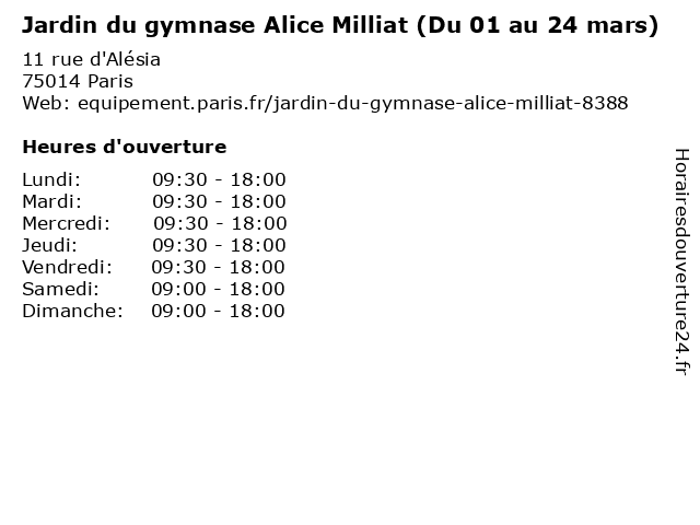 1 Jardin du gymnase Alice Milliat (Du 29 octobre au 28 février) (Distance: 0,00 km) 11 rue d'Alésia, 75014 Paris 28, 29, alice, au, du, février, gymnase, jardin, milliat, octobre, parc, square 2 Jardin du gymnase Alice Milliat (Du 25 mars au 29 avril et septembre) (Distance: 0,00 km) 11 rue d'Alésia, 75014 Paris 25, 29, alice, au, avril, du, et, gymnase, jardin, mars, milliat, parc, septembre, square 3 Jardin du gymnase Alice Milliat (Du 30 avril au 31 août) (Distance: 0,00 km) 11 rue d'Alésia, 75014 Paris 30, 31, alice, août, au, avril, du, gymnase, jardin, milliat, parc, square 4 Jardin et aire de jeux de la ZAC Alésia-Montsouris (Du 01 au 24 mars) (Distance: 0,33 km) - avenue Reille, 75014 Paris 01, 24, aire, alésia, au, de, du, et, jardin, jeux, la, mars, montsouris, parc, square, zac 5 Parc Montsouris (Du 01 au 24 mars) (Distance: 0,37 km) 2 rue Gazan, 75014 Paris 01, 24, au, du, jardin, mars, montsouris, parc, square 6 Jardin Michelet (Du 01 au 24 mars) (Distance: 0,48 km) 233 ter rue de Tolbiac, 75013 Paris 01, 24, au, du, jardin, mars, michelet, parc, square |