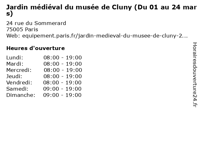 1 Jardin médiéval du musée de Cluny (Du 25 mars au 29 avril et septembre) (Distance: 0,00 km) 24 rue du Sommerard, 75005 Paris 25, 29, au, avril, cluny, de, du, et, jardin, mars, musée, médiéval, parc, septembre, square 2 Jardin médiéval du musée de Cluny (Du 30 avril au 31 août) (Distance: 0,00 km) 24 rue du Sommerard, 75005 Paris 30, 31, août, au, avril, cluny, de, du, jardin, musée, médiéval, parc, square 3 Jardin médiéval du musée de Cluny (Du 29 octobre au 28 février) (Distance: 0,00 km) 24 rue du Sommerard, 75005 Paris 28, 29, au, cluny, de, du, février, jardin, musée, médiéval, octobre, parc, square 4 Square Paul Painlevé (Du 01 au 24 mars) (Distance: 0,02 km) 2 place Paul Painlevé, 75005 Paris 01, 24, au, du, jardin, mars, painlevé, parc, paul, square 5 Musée national du Moyen Âge (Distance: 0,06 km) 6 place Paul Painlevé, 75005 PARIS arts, du, expositions, moyen, musée, national, travaux, âge 6 Cluny Museum - National Museum of Medieval Art (Distance: 0,06 km) 6 Place Paul Painlevé, 75005 Paris art, cluny, establishments, history, medieval, museum, museums, national, of |
