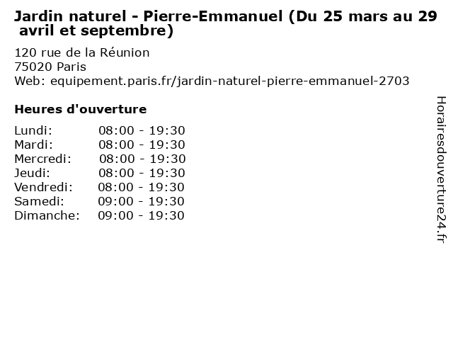1 Jardin naturel - Pierre-Emmanuel (Du 29 octobre au 28 février) (Distance: 0,00 km) 120 rue de la Réunion, 75020 Paris 28, 29, au, du, emmanuel, février, jardin, naturel, octobre, parc, pierre, square 2 Jardin Damia (Du 25 mars au 29 avril et septembre) (Distance: 0,52 km) 24 rue Robert et Sonia Delaunay, 75011 Paris 25, 29, au, avril, damia, du, et, jardin, mars, parc, septembre, square 3 Square Edouard-Vaillant (Du 25 mars au 29 avril et septembre) (Distance: 0,77 km) 50 avenue Gambetta, 75020 Paris 25, 29, au, avril, du, edouard, et, jardin, mars, parc, septembre, square, vaillant 4 Square Edouard-Vaillant (Du 29 octobre au 28 février) (Distance: 0,77 km) 50 avenue Gambetta, 75020 Paris 28, 29, au, du, edouard, février, jardin, octobre, parc, square, vaillant 5 Square Colbert (Du 25 mars au 29 avril et septembre) (Distance: 0,77 km) 159 rue de Charonne, 75011 Paris 25, 29, au, avril, colbert, du, et, jardin, mars, parc, septembre, square 6 Jardin Samuel-De-Champlain (Du 25 mars au 29 avril et septembre) (Distance: 0,79 km) 18 avenue Gambetta, 75020 Paris 25, 29, au, avril, champlain, de, du, et, jardin, mars, parc, samuel, septembre, square |