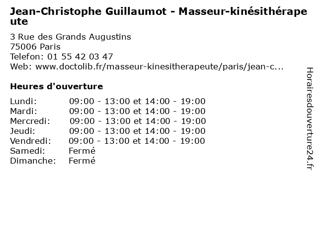 1 Jean-Christophe Guillaumot - Masseur-kinésithérapeute (Distance: 0,11 km) 16 Rue des Grands Augustins, 75006 Paris christophe, docteur, guillaumot, jean, kinésithérapeute, masseur, médecin, médecine, secrétariat 2 Christophe Arzel - Masseur-kinésithérapeute (Distance: 0,00 km) 3 Rue des Grands Augustins, 75006 Paris arzel, christophe, kiné, kinésithérapeute, masseur, rééducation, soin 3 Maître Christophe Baert - Avocat (Distance: 0,31 km) 116 Boulevard Saint Germain, 75006 Paris avocat, avocats, baert, cabinet, christophe, conseils, contentieux, juridique, justice, litiges, maître, services 4 Maître Christophe Saltzmann - Avocat (Distance: 0,31 km) 116 Boulevard Saint Germain, 75006 Paris avocat, avocats, cabinet, christophe, conseils, contentieux, juridique, justice, litiges, maître, saltzmann, services 5 Maître Jean-Christophe Guy - Avocat (Distance: 1,00 km) 222 boulevard Saint Germain, 75007 Paris avocat, avocats, cabinet, christophe, conseils, contentieux, guy, jean, juridique, justice, litiges, maître, services 6 Christophe Robin (Distance: 1,49 km) 228 Rue de Rivoli, 75001 Paris christophe, hair salon, robin, salon |