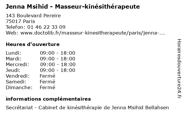 1 Jenna Bellahsen - Masseur-kinésithérapeute (Distance: 0,00 km) 143 Boulevard Pereire, 75017 Paris bellahsen, jenna, kiné, kinésithérapeute, masseur, rééducation, soin 2 Maître Jenna Scaglia - Avocate (Distance: 3,98 km) 61 Rue Henri Regnault, 92400 Courbevoie avocate, avocats, civils, droits, jenna, juridiques, maître, scaglia 3 Maître Jenna Scaglia - Avocate (Distance: 4,95 km) 28 Rue du Château d’Eau, 75010 Paris avocate, avocats, cabinet, conseils, contentieux, jenna, juridique, justice, litiges, maître, scaglia, services 4 Jenna Singer - Pédicure-podologue (Distance: 5,40 km) 34 Avenue du Général Sarrail, 75016 Paris jenna, orthoplastie, podologue, pédicure, pédicurie, singer 5 Jenna Guiheux - Ostéopathe (Distance: 8,62 km) 42 Avenue Jeanne d'Arc, 94110 Arcueil actes et symptômes, dysfonctionnement temporo-mandibulaire dtm, expertises, guiheux, jenna, ostéopathe, ostéopathie de la femme enceinte 6 Jenna Soufi - Psychologue (Distance: 10,89 km) 36 Rue du Général Leclerc, 78360 Montesson folie, jenna, psychiatre, psychiatrie, psychiatrique, psychologue, soufi |