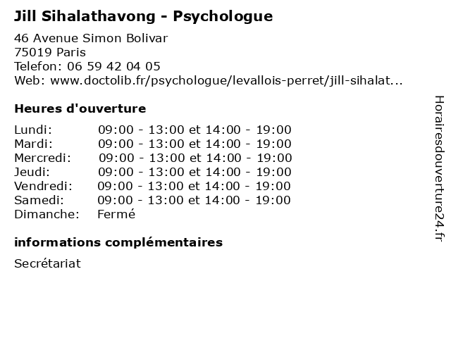 1 Georgeta Sihalathavong - Psychologue (Distance: 2,48 km) 20 Rue Marguerite de Rochechouart, 75009 Paris cabinets, georgeta, médecins, psychologue, secrétariat, sihalathavong, thérapies 2 Jill Schinazi - Psychologue (Distance: 8,15 km) 5 Rue Antoine Arnauld, 75016 Paris jill, psy, psychiatre, psychologue, sante, schinazi, soins 3 Georgeta Sihalathavong - Psychologue - secrétariat (Distance: 15,59 km) 15 Rue du Maréchal Foch, 95120 Ermont cabinets, fenigstein, georgeta, médecins, psychologue, secrétariat, sihalathavong, thérapies 4 Charlene Simoes - Psychologue (Distance: 0,00 km) 46 Avenue Simon Bolivar, 75019 Paris charlene, folie, psychiatre, psychiatrie, psychiatrique, psychologue, simoes 5 Marie Colombe Lesrel - Ostéopathe (Distance: 0,07 km) 56 Avenue Simon Bolivar, 75019 Paris care, clinic, colombe, dentist, france, gynécologue, health, kinesitherapeute, lesrel, marie, ophtalmologiste, orl, ostéopathe, psychologue, service 6 Vanessa Benzikri Levy-Bredoire - Psychologue (Distance: 0,36 km) 41 Rue Manin, 75019 Paris benzikri, bredoire, levy, psy, psychiatre, psychologue, sante, soins, vanessa |