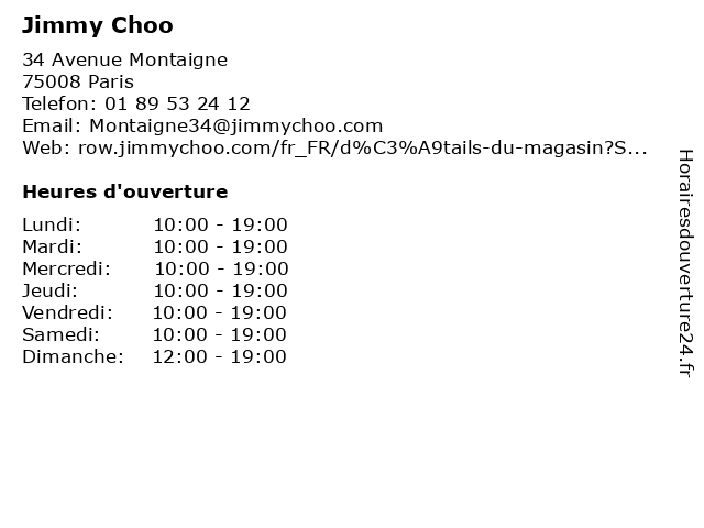 2 Jimmy Choo (Distance: 1,44 km) 376 Rue Saint-Honoré, 75001 Paris accessoires, baskets, chaussures, choo, femmes, hommes, jimmy, mode 3 Jimmy Choo (Distance: 1,78 km) 64 Boulevard Haussmann, 75009 Paris accessoires, choo, femme, homme, jimmy 4 Jimmy Choo (Distance: 2,00 km) 40 Boulevard Haussmann, 75009 Paris accessoires, choo, femme, homme, jimmy 5 Jimmy Choo (Distance: 2,77 km) 19 Rue de la Monnaie, 75001 Paris accessoires, choo, femme, homme, jimmy 6 Dr Jimmy Gross - Rhumatologue (Distance: 1,47 km) 17 Avenue de Tourville, 75007 Paris dr, gross, jimmy, rhumatisme, rhumatologue, sante, soins |