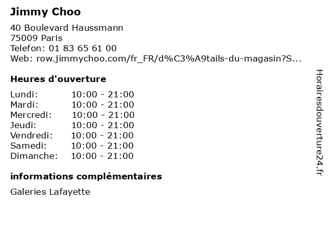 1 Jimmy Choo (Distance: 0,24 km) 64 Boulevard Haussmann, 75009 Paris accessoires, choo, femme, homme, jimmy 3 Jimmy Choo (Distance: 0,81 km) 376 Rue Saint-Honoré, 75001 Paris accessoires, baskets, chaussures, choo, femmes, hommes, jimmy, mode 4 Jimmy Choo (Distance: 1,69 km) 19 Rue de la Monnaie, 75001 Paris accessoires, choo, femme, homme, jimmy 5 Jimmy Choo (Distance: 2,00 km) 34 Avenue Montaigne, 75008 Paris accessoires, choo, femme, homme, jimmy 6 Jimmy Fairly (Distance: 0,02 km) 40 Boulevard Haussmann, 75009 Paris accessoires, boutique, fairly, jimmy, lunettes, mode, optique |