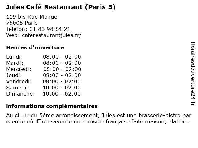 Termes de recherche pour Jules Café Restaurant (Paris 5):restaurant, café, bar, paris, restaurants, jules, traiteur, vinotheque, restaurant pour le petit-déjeuner, bar-salon, club de musique live |
