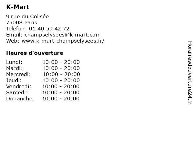 1 K-Mart Champs Élysées (Distance: 0,00 km) 9 Rue du Colisée, 75008 Paris alimentaire, alimentation, asiatique, champs, fruits, légumes, mart, supérette, élysées, épicerie 2 K-Mart Opéra (Distance: 2,10 km) 4-8 Rue Sainte-Anne, 75001 Paris alimentaire, alimentation, asiatique, fruits, légumes, mart, opéra, supérette, épicerie 3 K-Mart Beaugrenelle (Distance: 2,84 km) 9-11 Rue Robert de Flers, 75015 Paris alimentaire, alimentation, asiatique, beaugrenelle, fruits, légumes, mart, supérette, épicerie 4 Peugeot Darl'mart (Distance: 6,51 km) 105 Avenue d'Italie, 75013 Paris auto repair, business, cars, darl'mart, peugeot, shops 5 Amman Mini Market (Distance: 3,71 km) 101 Rue du Faubourg Saint Martin, 75010 Paris alimentation, amman, boisson, market, mini, supérette, surgelé, épicerie 6 Dong Nam A (Distance: 6,58 km) 64 Avenue de Choisy, 75013 Paris dong, fruits, légumes, nam, riz, surgelé, épicerie |