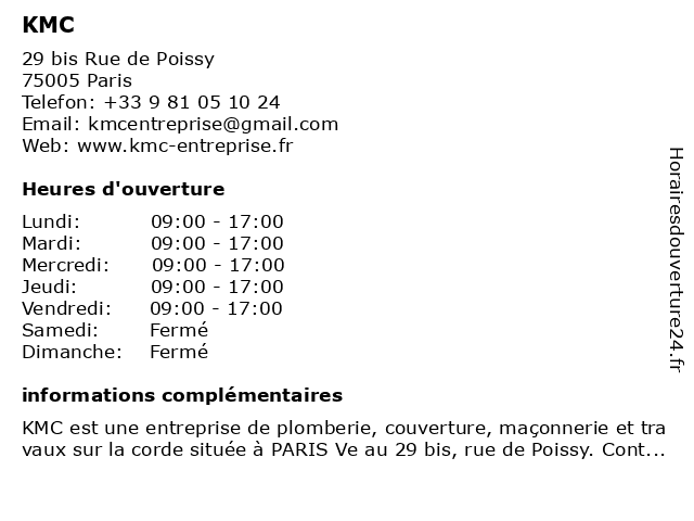 KMC est une entreprise de plomberie, couverture, maçonnerie et travaux sur la corde située à PARIS Ve au 29 bis, rue de Poissy. Contactez-nous.
