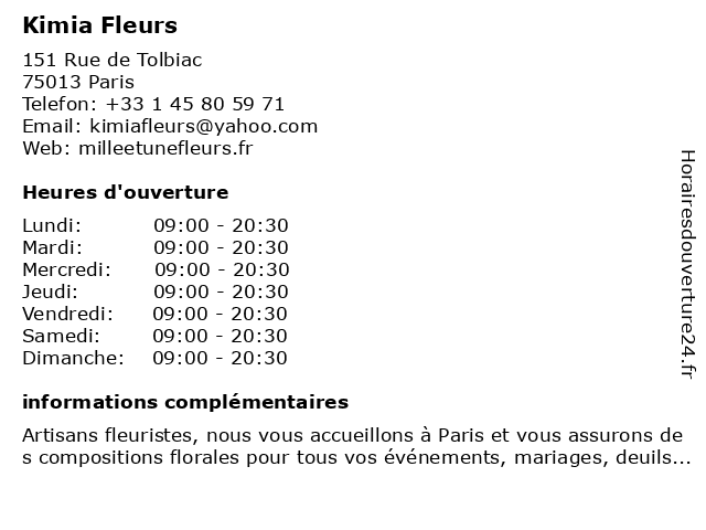 1 Mille et Une Fleurs (Distance: 0,00 km) 151 Rue de Tolbiac, 75013 Paris bouquets, composition, et, fleuriste, fleurs, mille, plantes, une 2 Fleurs d'Italie (Distance: 0,55 km) 203-205 Boulevard Vincent Auriol, 75013 Paris d'italie, décoration, fleurs, italie, magasin, paris 3 Monceau Fleurs (Distance: 0,89 km) 2 place Pinel, 75013 Paris boutique, cadeaux, fleuriste, fleurs, monceau, offrir 4 Les Fleurs de Bach - Institut Thérach'i (Distance: 1,30 km) 11 Boulevard Port Royal, 75013 Paris bach, boutique, de, fleurs, institut, les, thérach'i 5 Monceau Fleurs (Distance: 1,60 km) 104 Rue Monge, 75005 Paris bouquet, cadeaux, fleur, fleuriste, fleurs, les deuil, mariage, monceau, plante, un service 6 L'Ile Aux Fleurs (Distance: 1,64 km) 63 Avenue de Fontainebleau, 94270 Le Kremlin-Bicêtre aux, cafe, chaussures, enfants, fleurs, homme, l'ile, mode femme, parfumeries, restaurant, servicies, sport |