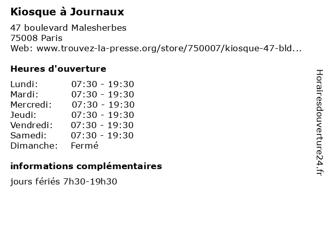 1 Kiosque à Journaux (Distance: 0,08 km) 112 boulevard Haussmann, 75008 Paris journaux, kiosque, magazine, presse 2 Kiosque à Journaux (Distance: 0,09 km) 5 place Saint Augustin, 75008 Paris journaux, kiosque, magazine, presse, revues 3 Kiosque à Journaux (Distance: 0,40 km) 110 rue Saint Lazare, 75008 Paris journaux, kiosque, magazine, presse, revues 4 Kiosque à Journaux (Distance: 0,49 km) 87 boulevard Malesherbes, 75008 Paris journaux, kiosque, magazine, presse, revues 5 Kiosque à Journaux (Distance: 0,50 km) 4 boulevard Malesherbes, 75008 Paris journaux, kiosque, magazine, presse, revues 6 Kiosque à Journaux (Distance: 0,67 km) 16 boulevard de la Madeleine, 75008 Paris journaux, kiosque, magazine, presse, revues |