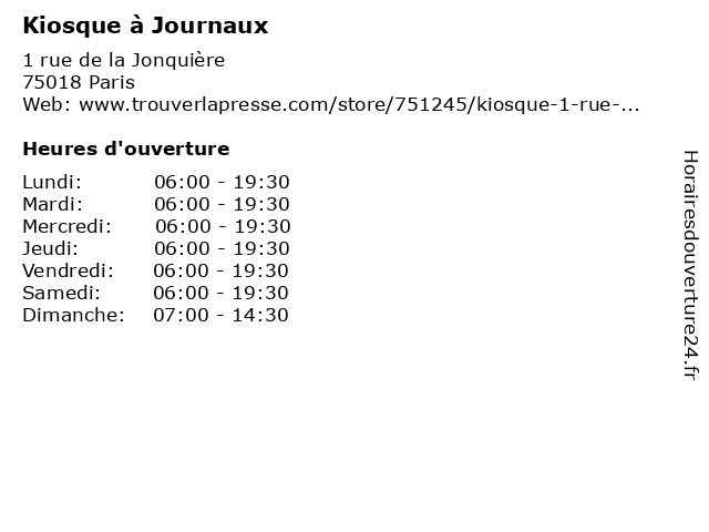 1 Kiosque à Journaux (Distance: 0,57 km) 144 avenue de Clichy, 75017 Paris journaux, kiosque, magazine, presse, revues 2 Kiosque à Journaux (Distance: 0,75 km) 173 rue Ordener, 75018 Paris journaux, kiosque, magazine, presse, revues 3 Kiosque à Journaux (Distance: 0,98 km) 12b avenue de Clichy, 75018 Paris journaux, kiosque, magazine, presse 4 Kiosque à Journaux (Distance: 1,31 km) 2 Place Jules Joffrin, 75018 Paris journaux, kiosque, magazine, presse, revues 5 Kiosque à Journaux (Distance: 1,49 km) 65bis avenue Gabriel Péri, 93400 Saint-Ouen journaux, kiosque, magazine, presse, revues 6 Kiosque à Journaux (Distance: 1,69 km) 2 boulevard Ornano, 75018 Paris journaux, kiosque, magazine, presse, revues |