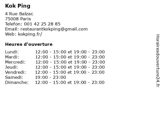 1 Restaurant Asiatique Kok ping (Distance: 0,06 km) 4 Rue Balzac, 75008 Paris asiatique, boisson, kok, nourriture, ping, restaurant, service 3 Thai Kok (Distance: 5,19 km) 56 Rue Amelot, 75011 Paris asiatique, kok, restaurant, restauration, riz, thai 4 Gossima Ping Pong Bar (Distance: 6,09 km) 4 Rue Victor Gelez, 75011 Paris bar, boissons, cocktail, gossima, musique, ping, pong, pub, restauran 5 Restaurant Kok (Distance: 7,46 km) 129bis Avenue de Choisy, 75013 Paris asia, asiatique, kok, restaurant, restauration 6 |