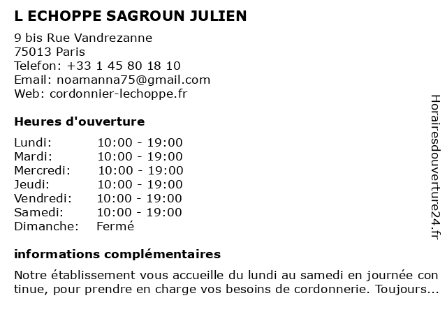 | Samedi | 10:00-19:00 |