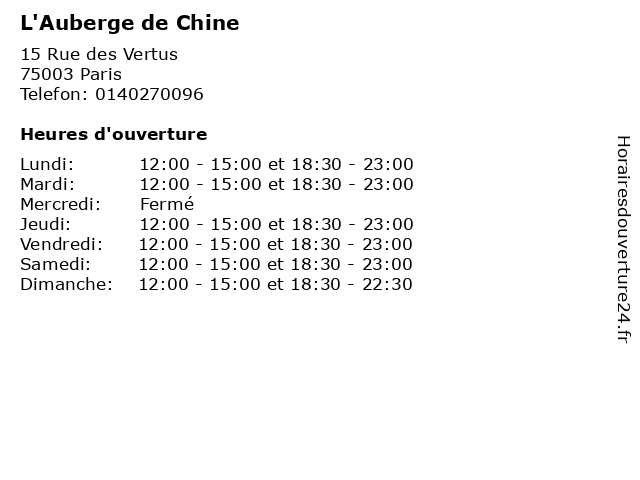 | Dimanche | 12:00-15:00 et 18:30-22:30 |