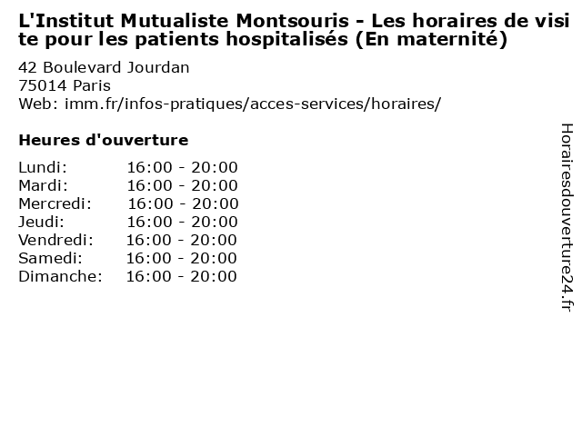 Termes de recherche pour L'Institut Mutualiste Montsouris - Les horaires de visite pour les patients hospitalisés (En maternité):en, les, de, horaires, bureau, med, pour, mutualiste, maternite, l'institut, consultation, montsouris, la médecine, dr, patients, visite, la maladie, la pratique, hospitalisés |