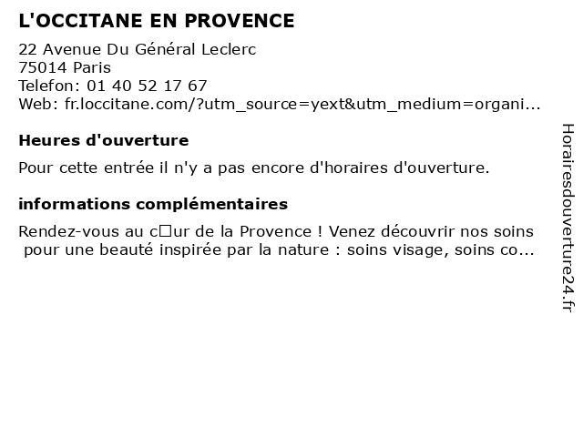 1 L'OCCITANE EN PROVENCE (Distance: 1,31 km) 17 Boulevard gare montparnasse, 75741 Paris boutique de cadeaux, drugstores, en, l'occitane, provence 2 L'OCCITANE EN PROVENCE (Distance: 1,84 km) 2 Place D'italie Centre Commercial Italie, 75013 Paris boutique de cadeaux, drugstores, en, l'occitane, provence 3 L'OCCITANE EN PROVENCE (Distance: 1,93 km) 93 Rue De Rennes, 75006 Paris boutique de cadeaux, drugstores, en, l'occitane, provence 4 L'OCCITANE EN PROVENCE (Distance: 3,41 km) 99 Rue de rivoli carrousel du louvre, 75001 Paris boutique de cadeaux, drugstores, en, l'occitane, provence 5 L'OCCITANE EN PROVENCE (Distance: 3,47 km) Centre commercial forum les halles, 75001 Paris boutique de cadeaux, drugstores, en, l'occitane, provence 6 L'OCCITANE EN PROVENCE (Distance: 3,60 km) Gare de lyon hall 2, 75571 Paris boutique de cadeaux, drugstores, en, l'occitane, provence |