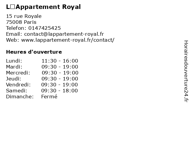 1 Le Village Royal (Distance: 0,08 km) 25 Rue Royale, 75008 Paris bar, boutique, café, centre, commercial, le, mode, restaurants, royal, village 2 Restaurant Crabe Royal (Distance: 0,28 km) 19 Place de la Madeleine,, 75008 Paris asiatique, crabe, cuisine, fruits de mer, repas, restaurant, restaurants, royal 3 Hotel Royal Opera (Distance: 0,45 km) 5 Rue de Castellane, 75008 Paris bar, hotel, opera, restaurant, royal, service 4 Le Royal Vendôme (Distance: 0,58 km) 26 rue Danielle Casanova, 75001 Paris boisson, brasserie, café, le, repas, restaurant, royal, vendôme 5 Royal Vendôme (Distance: 0,58 km) 26 Rue Danielle Casanova, 75002 Paris bar, bistro, bistrot, brasserie, café, pub, restaurant, restauration, resto, royal, vendôme 6 Hotel Royal Saint Honore Paris Louvre (Distance: 0,59 km) 221 Rue Saint Honore, 75001 Paris honore, hotel, louvre, paris, royal, saint |