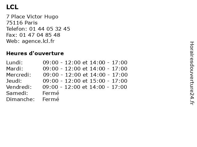 3 LCL (Distance: 0,74 km) 61 T Avenue de la Grande Armée, 75116 Paris agence, assurance, bancaire, banque, lcl 6 LCL (Distance: 0,89 km) 113 Rue de la Faisanderie, 75116 Paris agence, assurance, bancaire, banque, lcl |