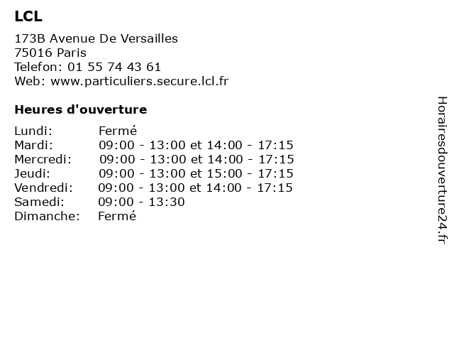 1 LCL (Distance: 0,28 km) 190 Avenue de Versailles, 75016 Paris agence, assurance, bancaire, banque, lcl 3 LCL (Distance: 1,36 km) 39 Route de la Reine, 92100 Boulogne-Billancourt agence, assurance, bancaire, banque, lcl 6 LCL (Distance: 1,92 km) 63 Rue Du General Leclerc, 92130 Issy Les Moulineaux banque, crédit, lcl, service |