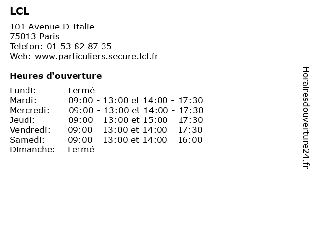 5 LCL (Distance: 1,01 km) 167 Boulevard Vincent Auriol, 75013 Paris agence, assurance, bancaire, banque, lcl 6 LCL (Distance: 1,23 km) 58 Avenue De Fontainebleau, 94270 Le Kremlin Bicetre agence, assurance, bancaire, banque, lcl |