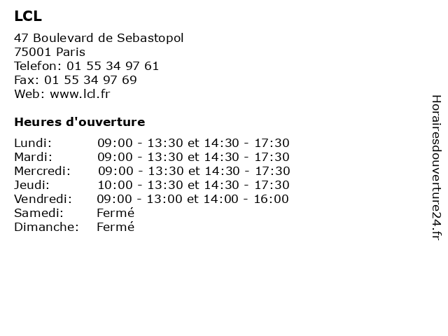 1 LCL (Distance: 0,26 km)7 Rue De Turbigo, 75001 Paris banque, crédit, lcl, service