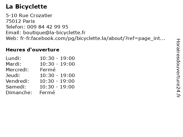 1 Paulette à Bicyclette - Joaillerie éthique (Distance: 0,74 km) 13 rue Paul Bert, 75011 Paris bicyclette, joaillerie, paris, paulette, éthique 2 CBD Bicyclette (Distance: 3,29 km) 130 Rue de Belleville, 75020 Paris aliments biologiques, bicyclette, cbd, infusions, suppléments, vitamines 3 A Bicyclette ! (Distance: 11,50 km) 34bis Quai Alphonse Le Gallo, 92100 Boulogne-Billancourt bar, bicyclette, café, restaurants 4 Bike+ Cycle Atelier (Distance: 0,15 km) 135 avenue Daumesnil, 75012 Paris atelier, bike+, cycle, cycles, loisirs, sport, sports, vélo, vélos, équipement 5 Culture Vélo (Distance: 0,21 km) 90 avenue Daumesnil, 75012 Paris accessoires, culture, cycliste, magasin, sport, vélo 6 Jour de Vélo (Distance: 0,50 km) 41 Rue de Citeaux, 75012 Paris accessoires, de, jour, pièces, service, vélo, équipement |
