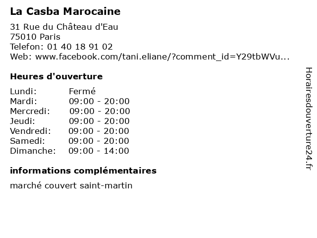 1 La Cantine Marocaine (Distance: 0,99 km) 23 Rue Richer, 75009 Paris cantine, couscous, la, marocain, marocaine, oriental, restaurant, traditionnel 2 Restaurant L'Etoile Marocaine (Distance: 4,40 km) 56 Rue Galilée, 75008 Paris bistrot, brasserie, café, l'etoile, marocaine, restaurant, restauration 3 LA TABLE MAROCAINE AM FOOD&SUPPLY (Distance: 6,54 km) 25 Rue Du Hameau, 75015 Paris 15ème am, food&supply, la, marocaine, table 4 La Table Marocaine (Distance: 6,59 km) 25 Rue du Hameau, 75015 Paris la, marocain, marocaine, restaurant, restauration, table 5 Societe Generale Marocaine De Banque (Distance: 10,64 km) 60, 93250 Villemomble banque, banques, commerciales, generale, marocaine, nationales, societe 6 La Table Marocaine Lina (Distance: 11,35 km) 170 Boulevard d' Alsace Lorraine, 94170 Le Perreux-sur-Marne la, lina, marocaine, restaurants, table |
