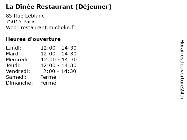 1 La Dînée Restaurant (Dîner) (Distance: 0,00 km) 85 Rue Leblanc, 75015 Paris beer, café, crêpes, dessert, dîner, dînée, la, restaurant, wine 2 Les Gourmands Disent Restaurant (Déjeuner) (Distance: 0,08 km) 235 Rue Saint-Charles, 75015 Paris beer, café, crêpes, dessert, disent, déjeuner, gourmands, les, restaurant, wine 3 Elysées Hong Kong Restaurant (Déjeuner) (Distance: 1,50 km) 80 rue Michel-Ange, 75016 Paris beer, café, crêpes, dessert, déjeuner, elysées, hong, kong, restaurant, wine 4 Relais d'Auteuil Restaurant (Déjeuner) (Distance: 1,73 km) 31 Boulevard Murat, 75016 Paris beer, café, crêpes, d'auteuil, dessert, déjeuner, relais, restaurant, wine 5 Le Pré Catelan Restaurant (Déjeuner) (Distance: 1,75 km) , Route de Suresnes, 75016 Paris beer, café, catelan, crêpes, dessert, déjeuner, le, pré, restaurant, wine 6 Etoile de Taroudant Restaurant (Déjeuner) (Distance: 5,46 km) 15 Rue d'Héliopolis, 75017 Paris beer, café, crêpes, de, dessert, déjeuner, etoile, restaurant, taroudant, wine |