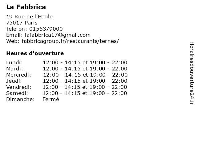 1 Fabbrica Saint-Georges (Distance: 3,06 km) 40 Rue Notre Dame de Lorette, 75009 Paris brasserie, burger, fabbrica, fastfood, georges, pizza, restaurant, restauration, saint 2 Fabbrica Montmartre (Distance: 3,16 km) 46 Rue Caulaincourt, 75018 Paris fabbrica, italien, livraisons, mastino, montmartre, pizza, pizzas, pizzeria, restaurant, restauration, sur place, à emporter 3 La Fabbrica De Luca (Distance: 14,83 km) 18 Rue De La Salle, 78100 St Germain En Laye fabbrica, luca, restaurants, tcs78 4 La Cantina Chic (Distance: 0,05 km) 14 rue de l'Etoile, 75017 Paris cantina, chic, italien, la, livraisons, pizza, pizzas, pizzeria, restaurant, restauration, sur place, à emporter 5 PAUL - fermé (Distance: 0,11 km) 18 Avenue des ternes, 75017 Paris boulangeries, boutique de desserts, café, fermé, paul, restaurant à emporter 6 Subway (Distance: 0,13 km) 47 Rue Des Acacias, 75017 Paris fast-food, restaurant à emporter, restaurants, subway |