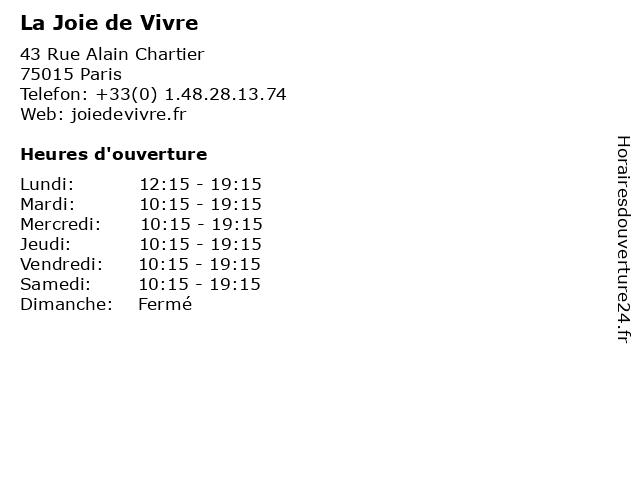 1 La Joie de Vivre (Distance: 3,36 km) 72 Rue de Seine, 75006 Paris de, furniture, joie, la, luminaires, meubles, textiles, vivre 2 Groupe Poste Habitat - Toit et Joie (Distance: 0,58 km) 82 rue Blomet, 75015 Paris bailleurs, et, groupe, habitat, hlm, immobiliers, joie, logement, poste, social, toit 3 Au Palais De Joie Nicosef (Distance: 1,39 km) 96 Rue Balard, 75015 Paris joie, nicosef, palais, restaurants 5 Crêpe de la Joie (Distance: 4,30 km) 4 Rue du Fer À Moulin, 75005 Paris business, crêpe, de, foods, joie, la, restaurants, vegan 6 Vivre et Savourer (Distance: 4,76 km) 35 rue du Rocher, 75008 Paris bistrot, et, restaurant, savourer, vivre |