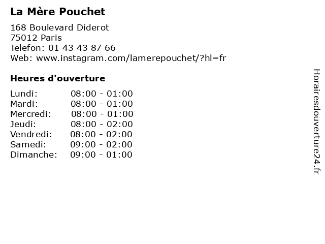 1 Chez Ma Belle Mère (Distance: 1,49 km) 257 Avenue Daumesnil, 75012 Paris apprenti, belle, chez, ma, mere, mère, restaurants 2 A c b Au Pere Pouchet (Distance: 1,97 km) 19 Boulevard Beaumarchais, 75004 Paris pere, pouchet, restaurants 3 Restaurant La Mère Poule (Distance: 2,29 km) 101 Rue Oberkampf, 75011 Paris bar, brasserie, café, la, mère, poule, restaurant, traditionnel 4 La Roche Mère (Distance: 2,42 km) 7 Rue Gambey, 75011 Paris boutique, cristals, la, minéraux, mère, pierres, roche 5 À la Mère de Famille (Distance: 3,17 km) 30 rue du Midi, 94300 Vincennes alimentation, de, epicerie, famille, la, magasins, mere, mère, pain, patisserie 6 Restaurant Mère Michèle (Distance: 3,57 km) 11 Rue Vicq d 'Azir, 75010 Paris bar, brasserie, café, michèle, mère, restaurant, restauration |