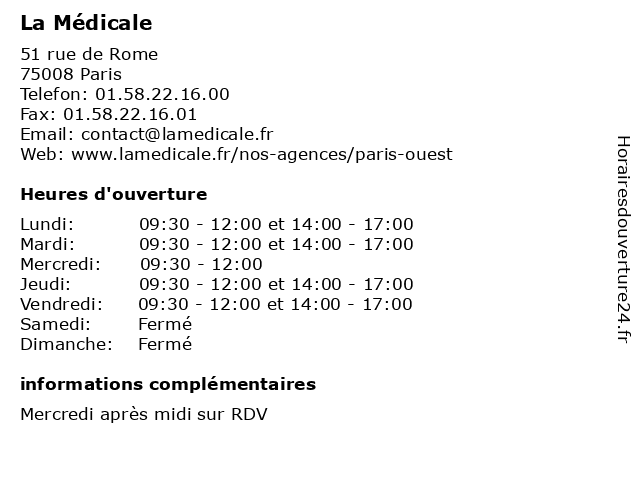 1 La Médicale (Distance: 6,19 km) 11 avenue Philippe Auguste, 75011 Paris assurances, la, médicale, santé 2 La Médicale (Distance: 11,89 km) 4 bis rue des Berthauds, 93110 Rosny Sous Bois assurances, la, médicale, santé 3 Optique Médicale Saint-Lazare (Distance: 0,43 km) 15bis Rue de la Pépinière, 75008 Paris lazare, lunettes, monture, médicale, opticien, optique, saint, solaire, vue 4 Laboratoire de Biologie Médicale - Saint-Petersbourg - Cerballiance (Distance: 0,55 km) 36 Rue De Saint-pétersbourg, 75008 Paris biologie, cerballiance, de, dépistages, laboratoire, médicale, petersbourg, saint 5 Centre d'Imagerie Médicale Malesherbes (Distance: 0,62 km) 105 Boulevard Malesherbes, 75008 Paris assistance médicale, assistance sociale, centre, d'imagerie, malesherbes, médecine, médecins, médicale, patient, radiologie, santé, traitement, écographie 6 Dr Marjorie Lalloum - Gynécologue médicale et obstétrique (Distance: 0,62 km) 68 Rue de Caumartin, 75009 Paris bebe, dr, et, gynecologie, gynécologue, lalloum, marjorie, maternite, médicale, obstetrique, obstétrique |