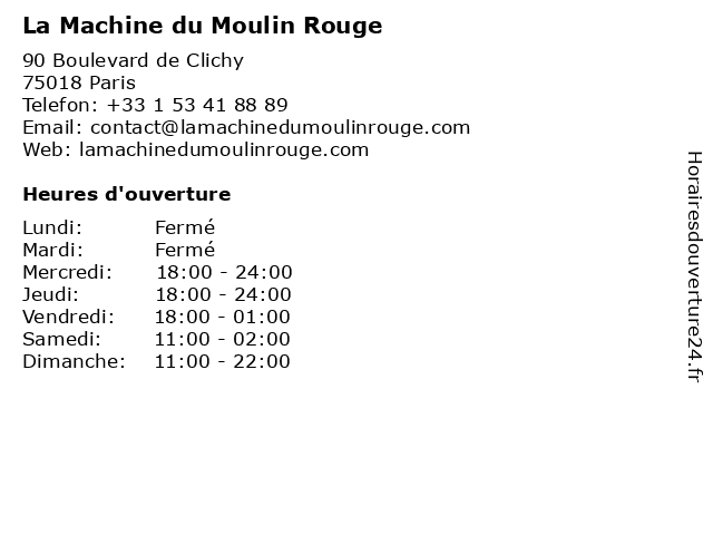 1 La Machine (Distance: 0,01 km) 90 boulevard de Clichy, 75018 Paris boissons, disco, la, machine, musique 2 Bal du Moulin Rouge (Distance: 0,01 km) 82 Boulevard de Clichy, 75018 Paris bal, cabaret, cucine, du, gastronomie française, moulin, rouge 5 Bar à Bulles - La Machine du Moulin Rouge (Distance: 0,06 km) 4 Cité Véron, 75018 Paris bar, boissons, bulles, cocktail, du, la, machine, moulin, musique, pub, rouge 6 Boulangerie Pâtisserie - Aux Délices du Moulin (Distance: 0,16 km) 35 Rue de Douai, 75009 Paris alimentation, aux, baguette, boulangerie, commerce, du, délices, gâteaux, moulin, pain, paris, pâtisserie |