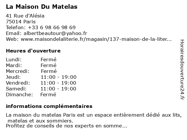 1 La Boutique du Matelas (Distance: 1,48 km) 147 Boulevard du Montparnasse, 75006 Paris boutique, du, la, matelas 2 Le Roi Du Matelas (Distance: 3,17 km) 100/102 Rue de la Croix Nivert, 75000 Paris aménagement de la maison, du, equipement de la maison, le, matelas, mobilier, roi 3 Le Matelas Vert (Distance: 3,62 km) 14 Rue Charles V, 75004 Paris bio, ecoresponsable, le, matelas, matelas écologiques, naturel, naturels français, vert 4 Matelas Factory (Distance: 5,87 km) 3 Allée Sainte Lucie, 92130 Issy-les-Moulineaux couettes, factory, matelas, oreillers et linge, sommiers 5 Le Roi Du Matelas (Distance: 6,29 km) 250 Boulevard Jean Jaurès, 92100 Boulogne Billancourt aménagement de la maison, du, equipement de la maison, le, matelas, mobilier, roi 6 |