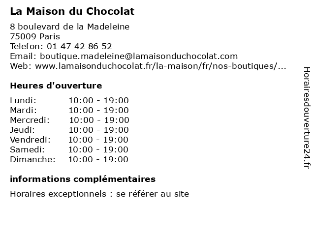 | Samedi | 10:00-19:00 |