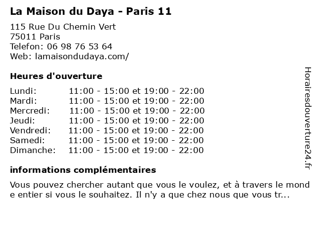 | Mardi | 11:00-15:00 et 19:00-22:00 |