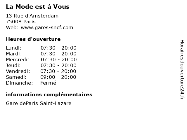 1 La Mode Est à Vous (Distance: 0,24 km) 1 Cour de Rome, 75008 Paris alimentation, beauté & sante, culture & loisirs, enfants, est, high-tech, la, maison & déco, mode, restaurants, vous 2 Christian Louboutin Le Printemps de la mode (Distance: 0,33 km) 64 Boulevard Haussmann, 75009 Paris christian, de, la, le, louboutin, maroquinerie, mode, printemps 3 Printemps de la Mode Corner (Distance: 0,36 km) 64 boulevard Haussmann, 75009 Paris bags, business, clothing, corner, de, la, mode, printemps, shoes, shopping, stores 4 Dr.Mathieu Bernard - Cardiologie (Consultation sur rendez-vous) (Distance: 0,41 km) 9 rue de Turin, 75008 Paris bernard, cardiologie, consultation, docteur, dr.mathieu, medecins, rendez, santé, sur, vous 5 Cabinet de Recrutement Manpower de Paris Commerce Mode Luxe (Distance: 0,46 km) 12 Bis Place Henri Bergson, 75008 Paris agence de recrutement, agence intérim, agence pour l'emploi, cabinet, cabinet de recrutement, cdi, commerce, de, intérim, luxe, manpower, mode, paris, recrutement 6 Agence d'Intérim Manpower Paris Couture Mode (Distance: 0,46 km) 12 Bis Place Henri Bergson, 75008 Paris agence, agence de recrutement, agence intérim, agence pour l'emploi, cabinet de recrutement, cdi, couture, d'intérim, intérim, manpower, mode, paris, recrutement |