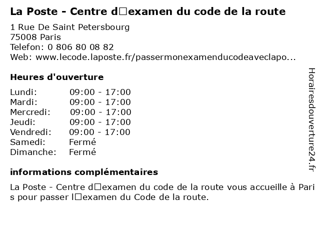 Termes de recherche pour La Poste - Centre d’examen du code de la route:poste, la, du, de, route, centre, code, d’examen, centre d'évaluation scolaire, école technique |
