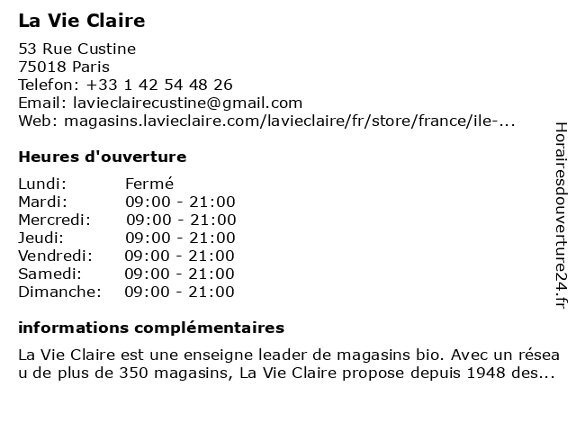 1 La Vie Claire (Distance: 2,27 km) 9/11 Place du Colonel Fabien, 75010 Paris alimentation bio, claire, la, magasins bio, produits bio, vie 2 La Vie Claire (Distance: 3,11 km) 76-80 Rue Saint-Honoré, 75001 Paris alimentation bio, claire, la, magasins bio, produits bio, vie 3 La Vie Claire (Distance: 3,90 km) 31 Rue Mazarine, 75006 Paris alimentation bio, claire, la, magasins bio, produits bio, vie 4 La Vie Claire (Distance: 5,46 km) 53 Avenue Philippe-Auguste, 75011 Paris alimentation bio, claire, la, magasins bio, produits bio, vie 5 La Vie Claire (Distance: 5,98 km) 25 rue de l'Annonciation, 75016 Paris claire, conseils bio, la, la volaille bio, le citron, le vin bio, les flocons d'avoine, recettes bio, vie 6 La Vie Claire (Distance: 6,00 km) 24 Rue Berbier du Mets, 75013 Paris alimentation bio, claire, la, magasins bio, produits bio, vie |
